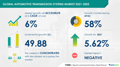 View original content to download multimedia:https://www.prnewswire.com/news-releases/automotive-transmission-systems-market-to-grow-by-usd-49-88-billion-and-record-a-cagr-of-over-6-during-2021-2025technavio-301270341.html